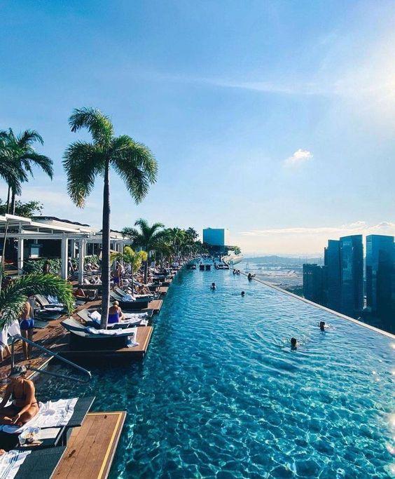 Фешенебельний готельMarina Bay Sands, розташований в Сінгапурі, є справжньою світовою пам'яткою, і багато в чому завдяки розкішному басейну. Дах цього готелю є величезною терасою з кількома рівнями, на якій крім басейнів є ландшафтний сад, просторі зони відпочинку, ресторани та бари. Головний і найбільший басейн у готелі розташований на 55 поверсі, під час водних процедур відпочиваючі можуть насолоджуватися шикарним панорамним видом міста.