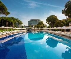 Тури в Белек Авіаквитки Розкішний готель з власним пляжем і величезною територією. Сучасні просторі номери оформлені в елегантному стилі і мають все необхідне. Тут є як номери вищої категорії, так і цілком бюджетні для готелю преміум-класу стандарти. П'ять ресторанів, кожен з яких має свій напрямок в кулінарії, і дев'ять барів не дозволять пересититися кулінарними враженнями, а кілька басейнів складають гідну конкуренцію прекрасного пляжу.